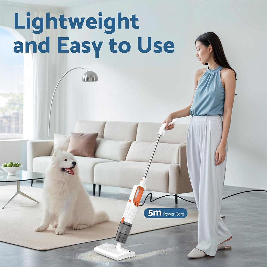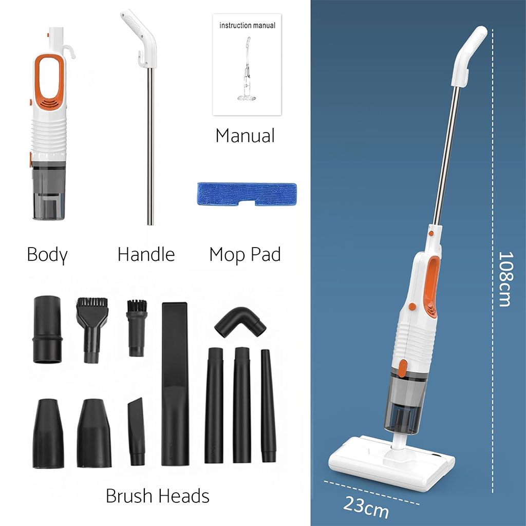 - Aspirateur balai filaire et serpillière : Aspiration et balayage en un seul geste, un nettoyage complet. L’angle de la tête de brosse est réglable à volonté et la direction est réglable sur plusieurs angles. Équipé de nombreux accessoires, dont une brosse 2 en 1 et un suceur plat, cet excellent aspirateur balai répond à tous vos besoins de nettoyage : escaliers, rebords de fenêtre, canapé, lit, bureau, rideaux, voiture, camping-car, etc.