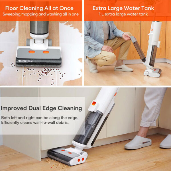- Aspirateur balai et serpillière combinés : une puissance d’aspiration de 18 000 Pa répond à divers besoins de nettoyage. L’aspirateur aspire tous les débris au sol. Réservoir d’eau et chiffon intégrés au fond. Les chiffons humides rendent le sol plus propre. Nettoyage et aspiration simultanés, un seul geste.