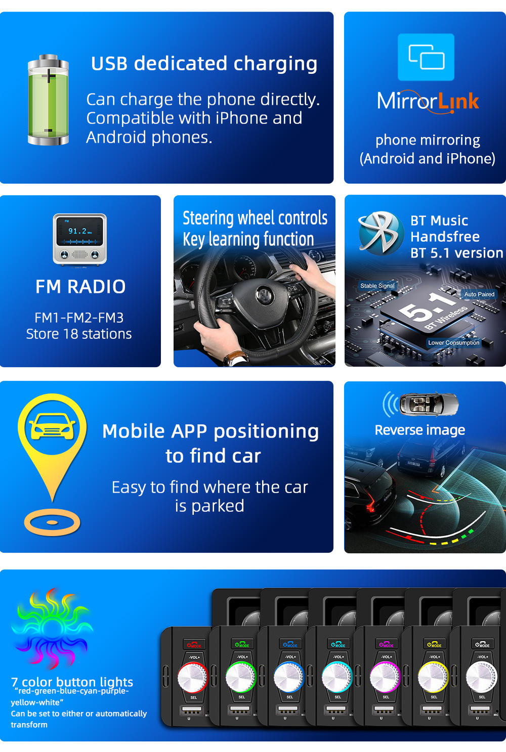 - Apprentissage des touches : cartographiez les touches du volant aux touches de fonction du lecteur de voiture par apprentissage, prend en charge plusieurs paramètres linguistiques.