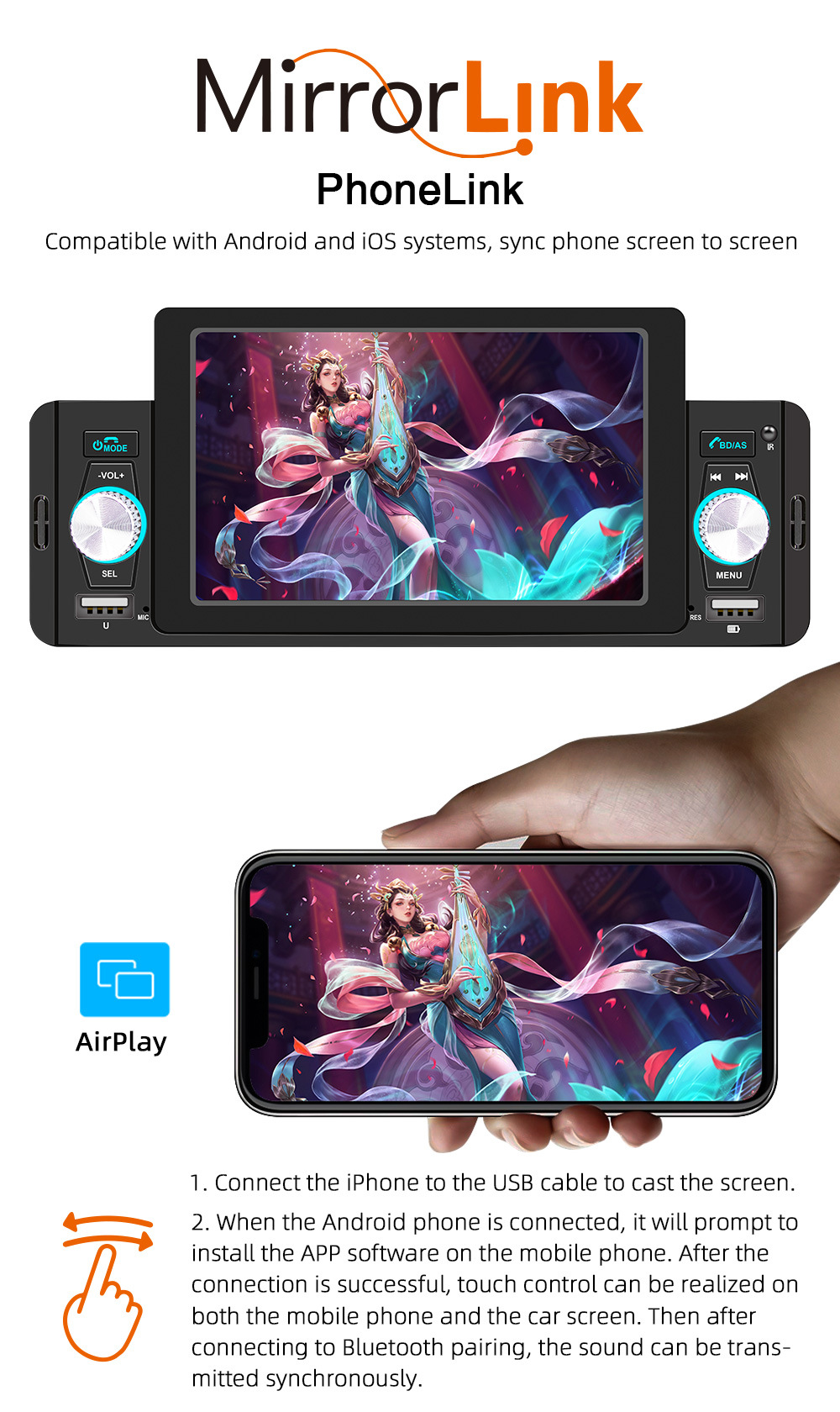 - Système compatible : le lecteur MP5 est adapté pour les systèmes Android et iOS, et peut synchroniser l’écran du téléphone avec l’écran du lecteur.