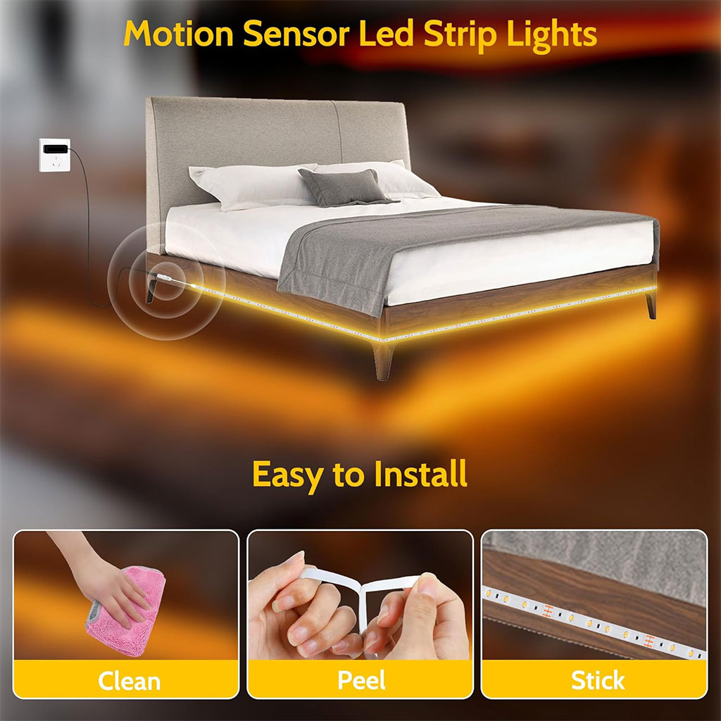 - Bande lumineuse LED à détecteur de mouvement : La bande LED s’étend jusqu’à 1,5 m. Son boîtier à activation par le mouvement est ergonomique pour une utilisation plus confortable.