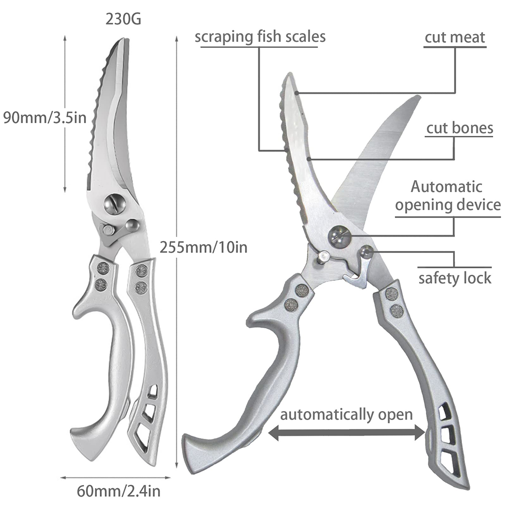 - Multifonction : offre des coupes précises et puissantes pour la viande, le poisson, les os de volaille et même les canettes. Son design avec zone forte concave et zone aiguisée avec dents ondulées la différence des ciseaux ordinaires. En outre, il dispose d’un ressort au centre et d’un verrou de sécurité qui le rendent encore plus confortable et sûr à utiliser.