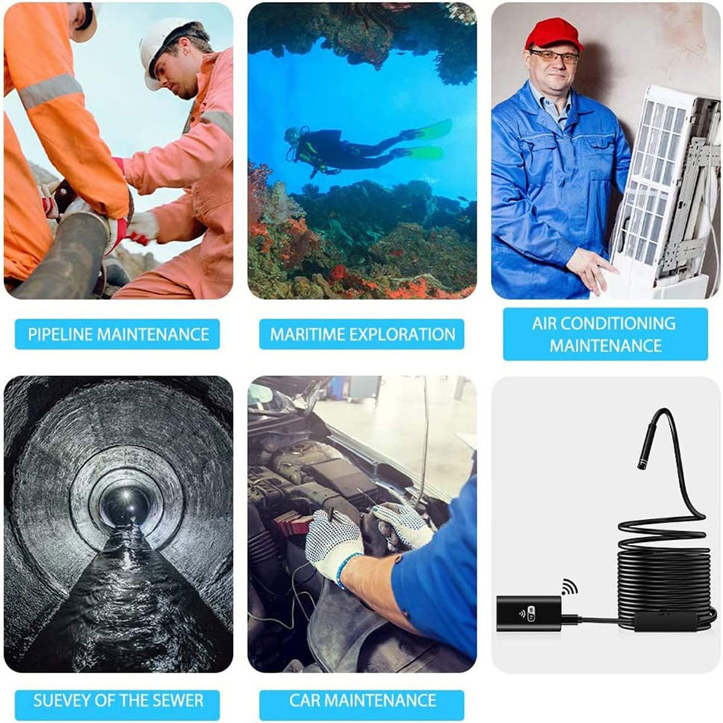 Cet endoscope convient à différents types d’environnement, par exemple, zone peu éclairée ou sombre, zone humide ou mouillée : mur, canalisations, climatiseur, crevasses, trous.