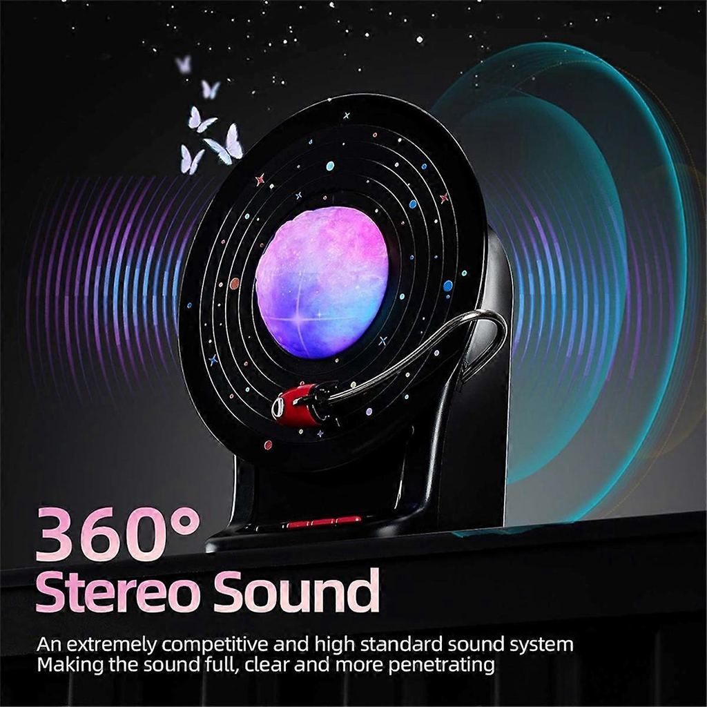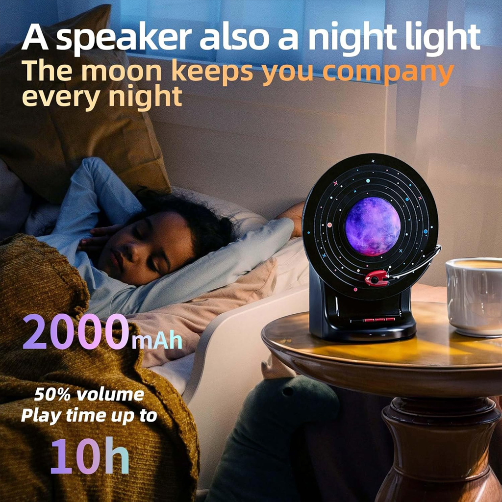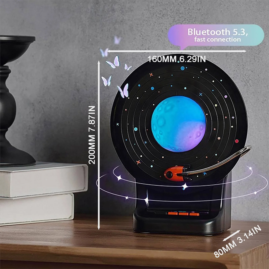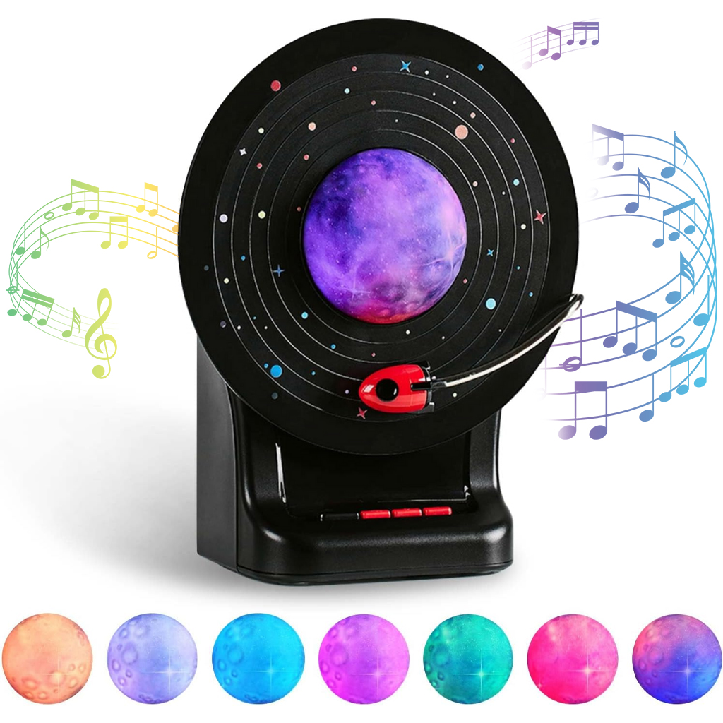 - Veilleuse au design innovant : alliant l’esthétique d’un disque vinyle à un ciel étoilé scintillant, elle met en scène un vaisseau spatial en orbite autour de la lune. Grâce à ses jeux de lumière et sa musique, elle crée une ambiance unique et une atmosphère presque sacrée, offrant une expérience nocturne hors du commun.