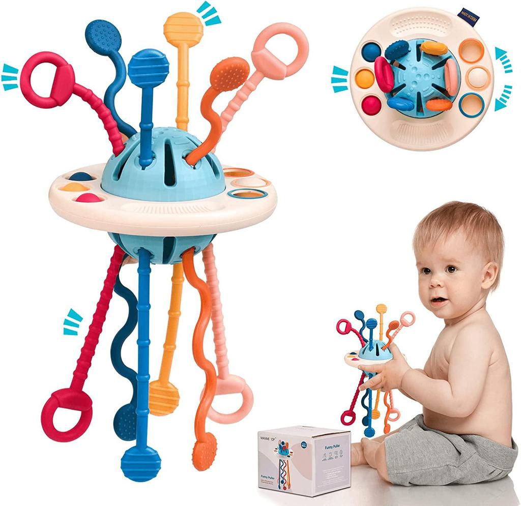 - Jouets pour les tout-petits de 1 an : ce jouet 4 en 1 sert de jouet à remonter pour bébé, de jouet à hochet shaker, de jouet pop-up et de jouet à bouton coulissant. Avec de nombreuses façons de jouer, ce jouet sensoriel pour bébé produit différents sons et frictions en tirant sur des cordes aux couleurs vives avec une texture unique, en les pressant, en les éclatant, en les mâchant et en les secouant. Aide à développer la motricité et offre des heures de plaisir éducatif.
