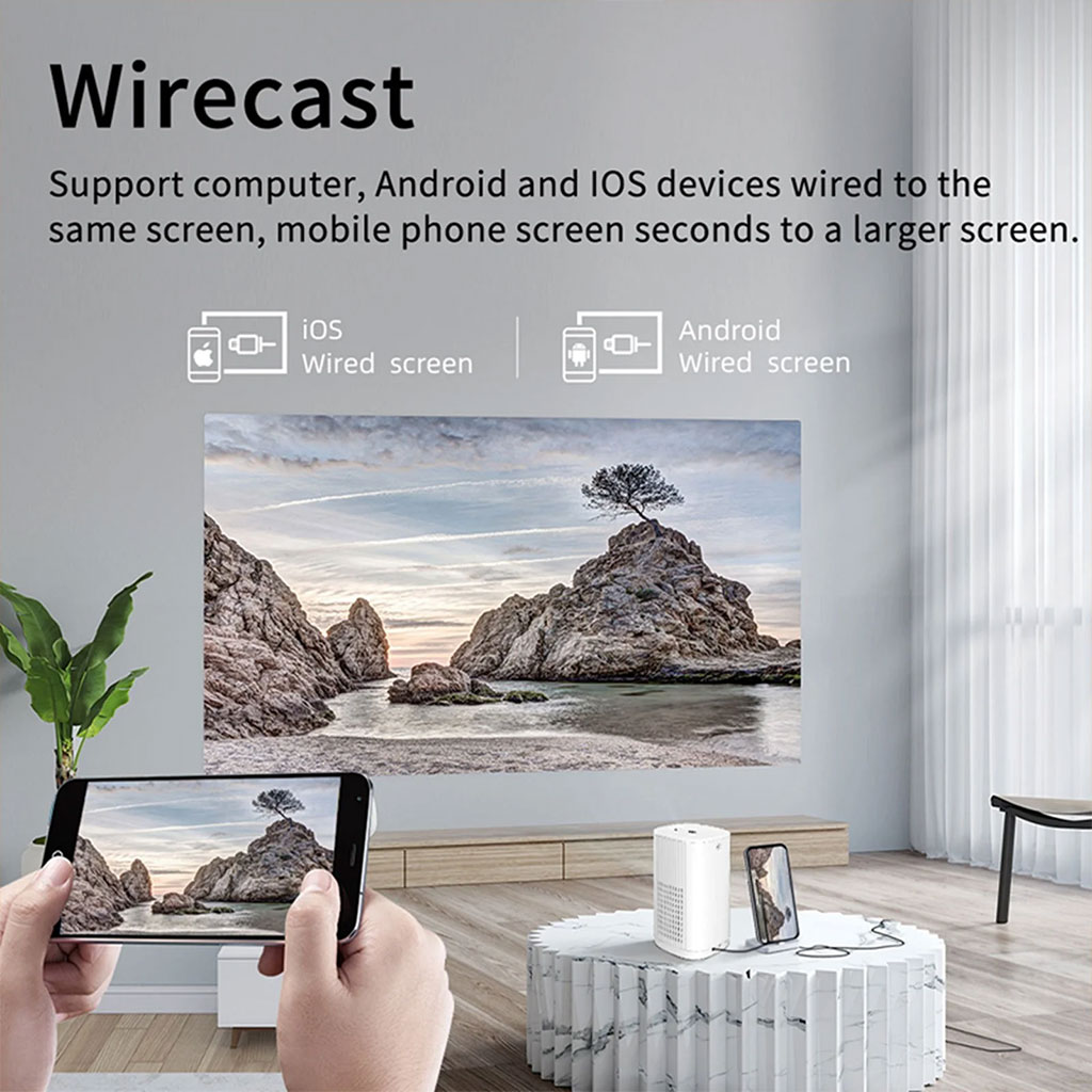 - ☞ Même technique d’écran : prise en charge sans fil ou filaire pour connecter votre téléphone à la projection qui réalise une expérience de visionnement grand format. De plus, prend en charge la technologie DLNA, la fonction Miracast et Airplay qui transporte sans fil votre vidéo ou fichier de votre téléphone au projecteur.