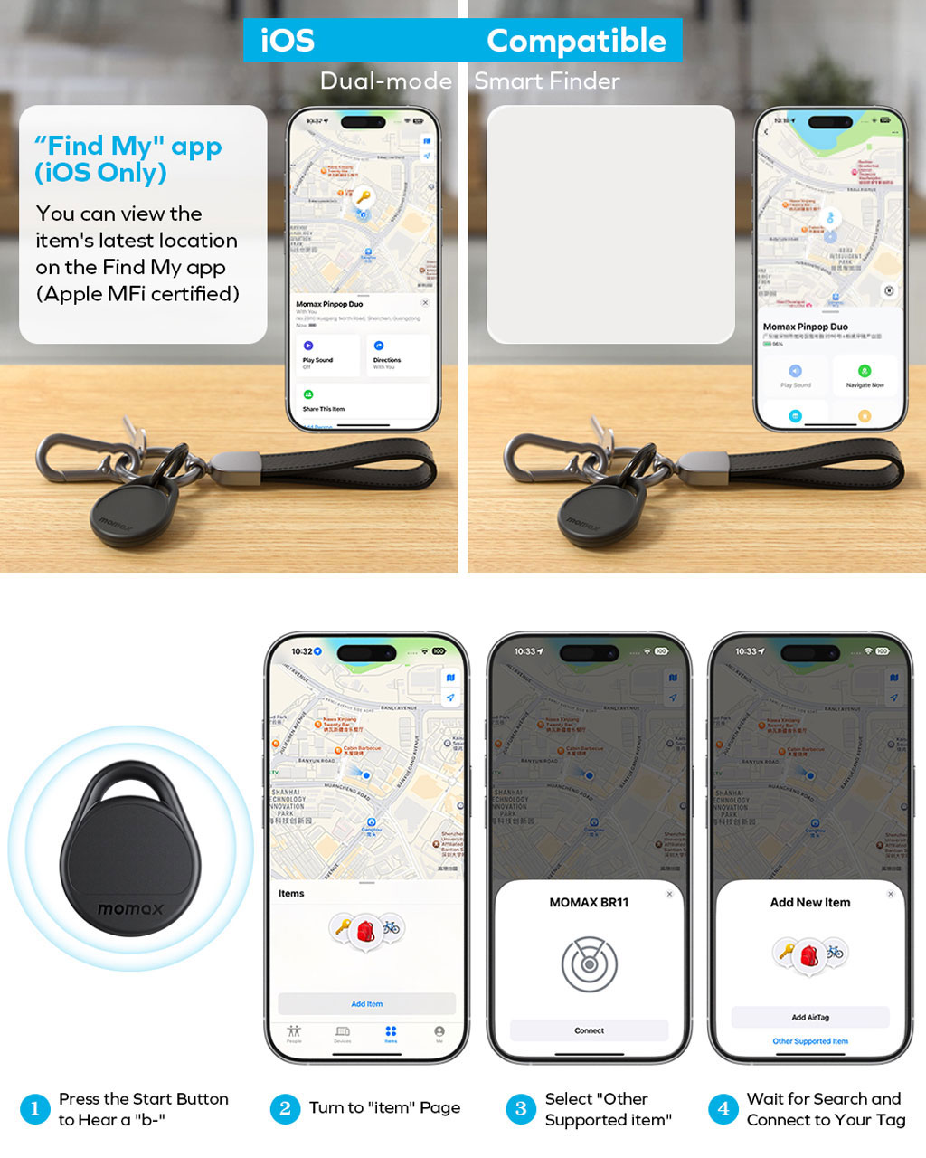 - 【Fonctionne avec Apple Find My *】 Momax Tracker Tag transforme facilement vos objets en dispositifs de suivi. Gardez un œil sur vos biens et partagez le suivi avec des amis ou des appareils via l’application Find My. Prend en charge jusqu’à 5 appareils partageant simultanément, de sorte que tout le monde reste dans la boucle.
