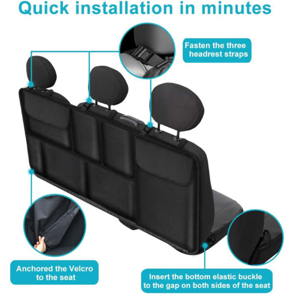 - Installation rapide en quelques secondes : le rangement de voiture se fixe en seulement trois étapes. La première consiste à fixer les trois clips réglables autour de l’appuie-tête ; la deuxième consiste à fixer le velcro à l’arrière du siège ; la dernière étape consiste à insérer la boucle élastique carrée dans l’espace entre les sièges de chaque côté.
