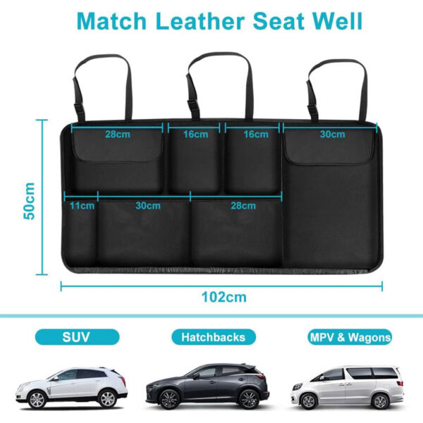 - 【Grande capacité】 L’organisateur de coffre dispose de nombreuses poches et pochettes de différentes tailles, idéales pour de nombreuses utilisations et différents types de clients, tels que des outils, des gants, de l’eau, des livres, etc. Il y a aussi une autre grande poche cachée, taille 17*12 pouces/45*30 cm pour les gros objets, comme les extincteurs, les produits de sport, les articles de voyage, etc.