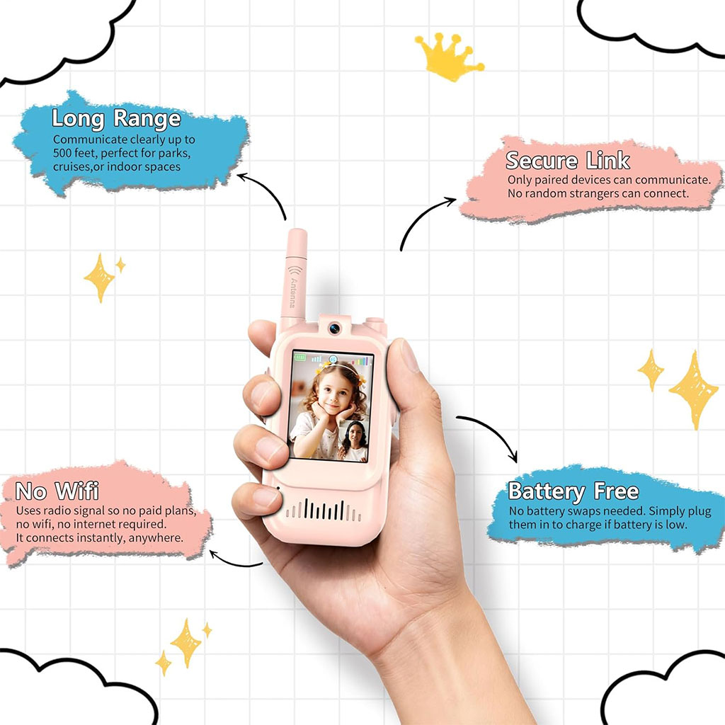 - JEU SÉCURISÉ ET PRIVÉ : ces talkies-walkies pour enfants utilisent un appairage automatique un-à-un pour créer un canal crypté entièrement privé. Aucune interférence, aucune communication croisée, juste une communication sûre et sécurisée pour vos petits.