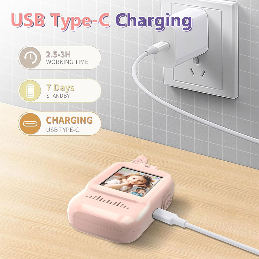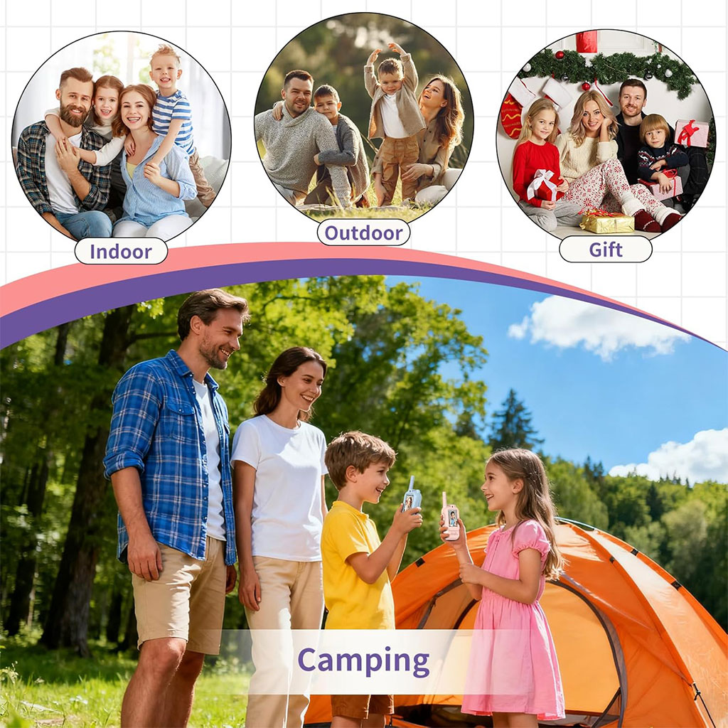 - MODES D’EFFETS SONORES INTÉGRÉS : Pour les talkies-walkies pour enfants — Appuyez longuement sur le bouton ” M ” pour choisir parmi 4 styles de voix (originale, enfant, monstre, homme) ; appuyez rapidement pour passer en mode vidéo. Parfait pour les jeux imaginatifs — rend les conversations plus amusantes, captive les enfants et stimule leur créativité.