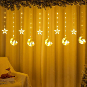 - 【Rideau lumineuse pour intérieur/extérieur】: Les guirlandes lumineuses LED en forme d’étoiles ont 2 designs différents : étoiles et lune, étoiles et château, 10 lumières suspendues (3M), comme beaux décors pour le Ramadan Moubarak intérieur extérieur ou aussi en cours d’année pour décorer les fenêtres, vous assure une atmosphère chaleureuse et romantique.