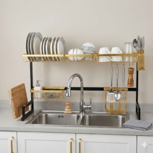 Égouttoir à vaisselle sur l’évier, avec crochets et support pour planche à découper gold