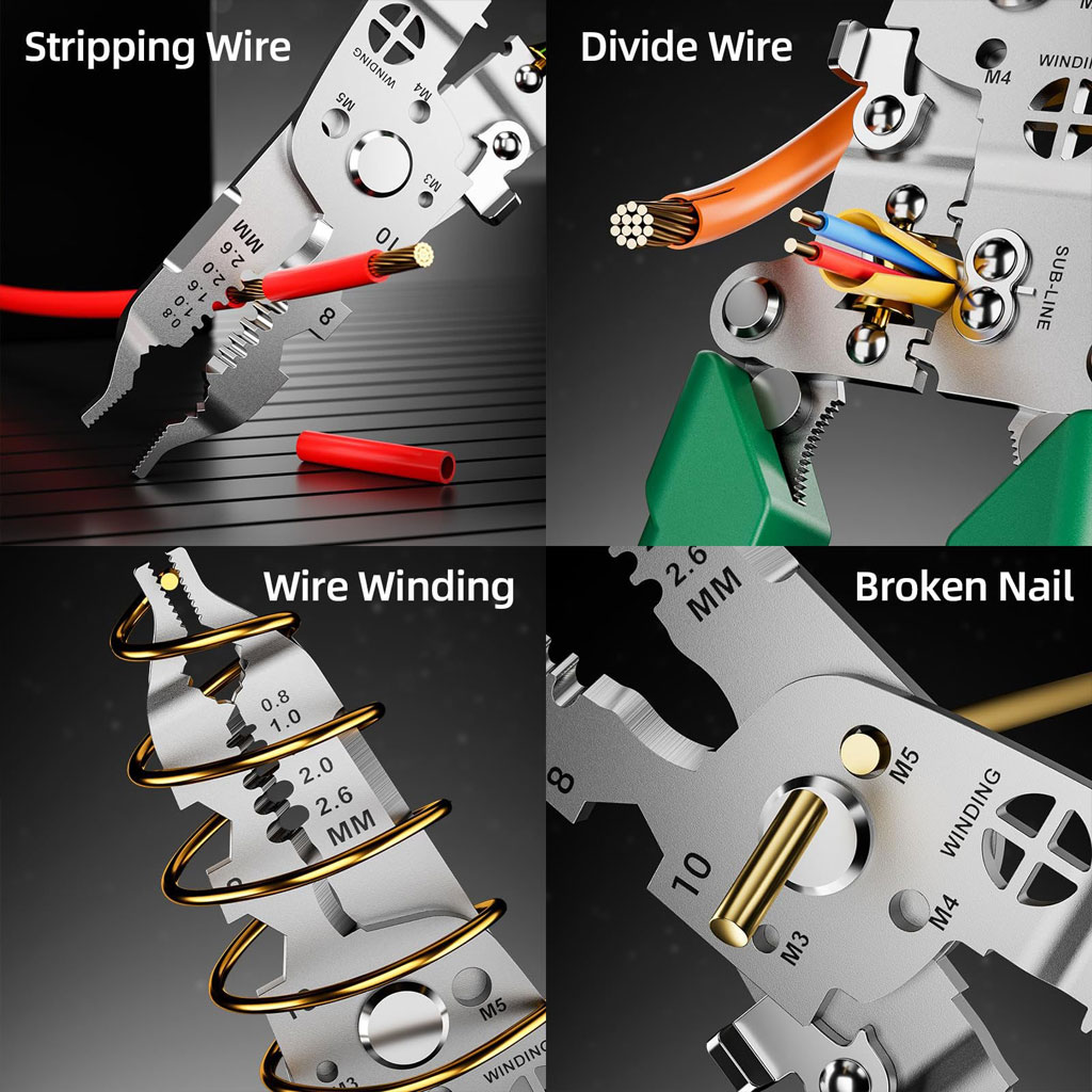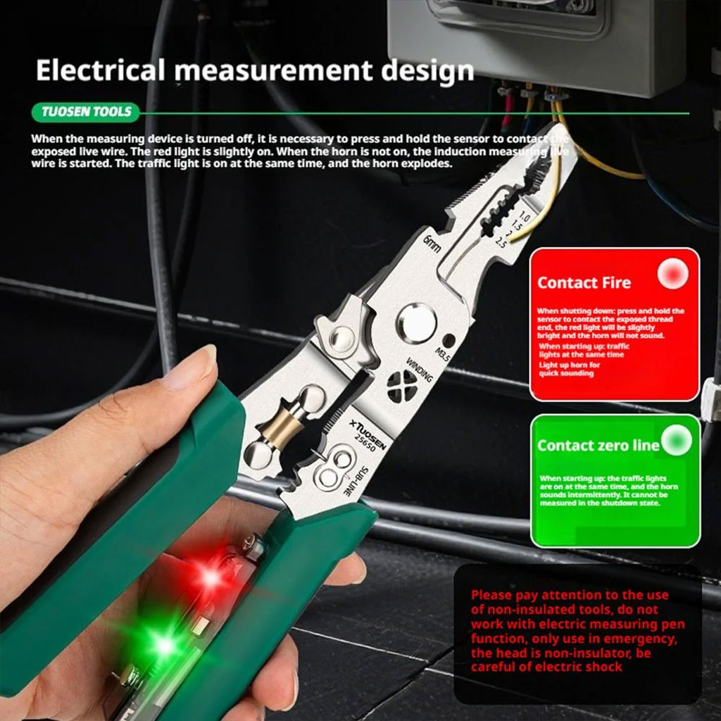 Découvrez l’outil efficace pour les électriciens avec nos pinces à dénuder, dotées de capacités de dénudage et de coupe à double fil combinées avec un testeur de tension intégré pour améliorer la fonctionnalité.