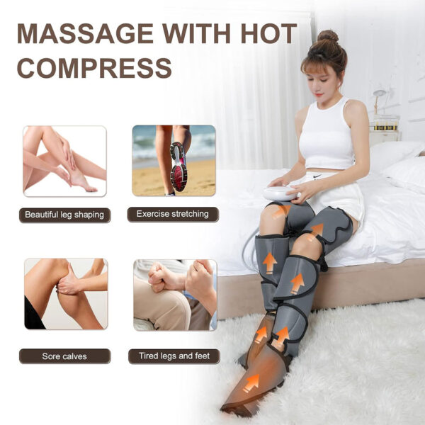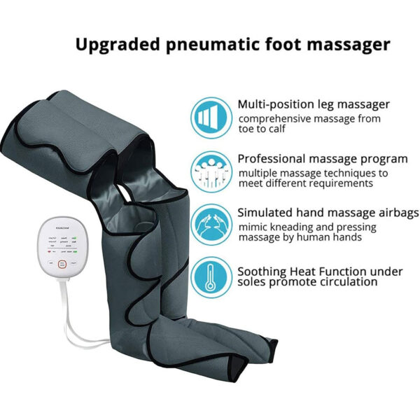 - La taille la plus appropriée — le coussin gonflable et le velcro du masseur de jambe sont allongés. Une taille convient à une variété de cuisses, mollets et pieds, quelle que soit l’épaisseur. L’espace de stockage léger et petit rend l’appareil de massage des pieds portable et peut être utilisé à la maison, au bureau, à la salle de sport ou en voyage.