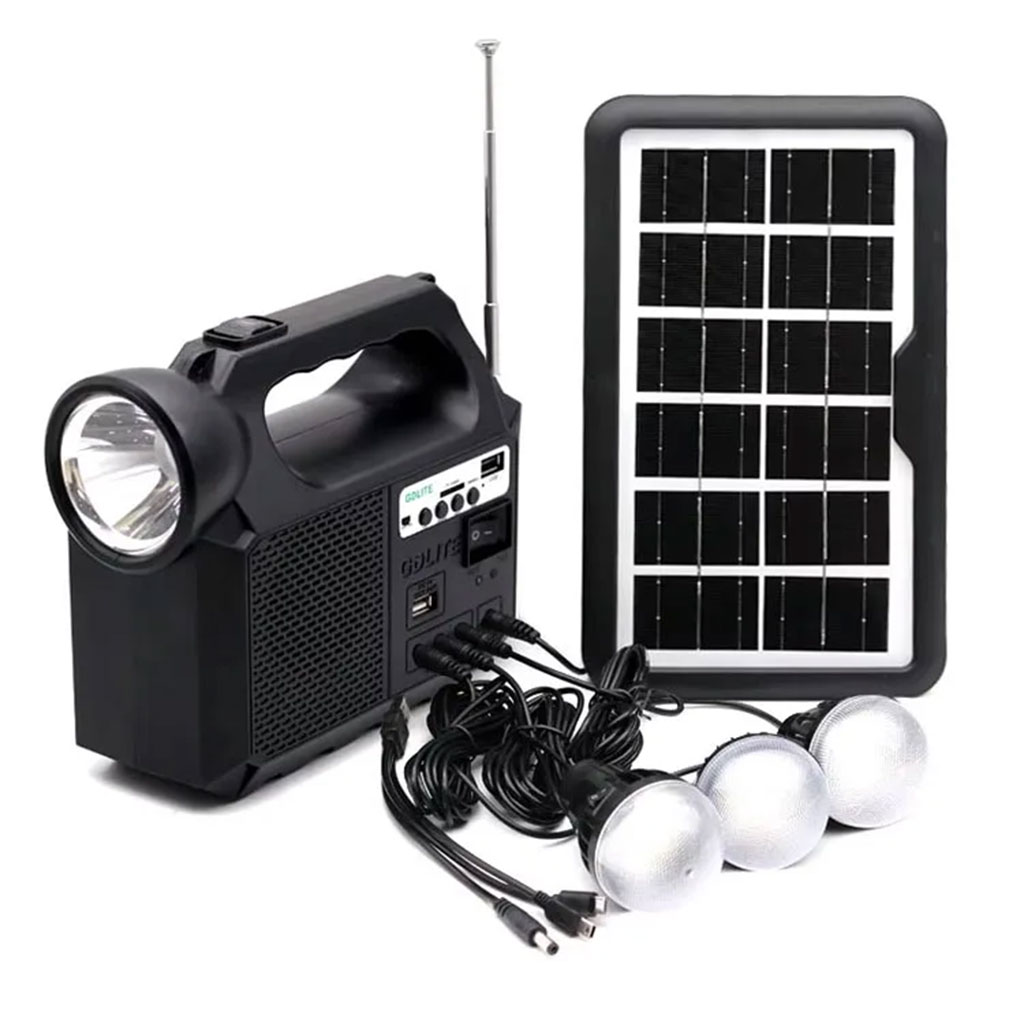 Le GDLITE GD8017 est un système d’éclairage solaire autonome, parfait pour les zones rurales, les campings ou les situations d’urgence. Il combine éclairage LED, radio FM, haut-parleur musical, et fonction de recharge USB dans un seul appareil compact et pratique.