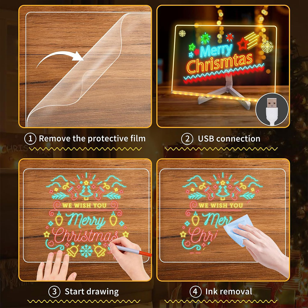 - Note d’utilisation : Bloc-notes LED, veuillez retirer le film protecteur double face de la plaque acrylique avant utilisation. Équipé d’un trépied réglable, placez le tableau blanc effaçable à sec à l’angle approprié.