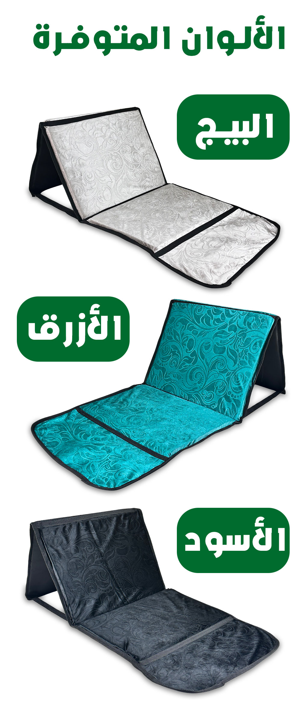 - Conception Pliable avec Dossier – تصميم قابل للطي مع مسند ظهر : Ce tapis de prière innovant est doté d’un dossier intégré, offrant un soutien supplémentaire pendant les prières et facilitant son utilisation en déplacement.
