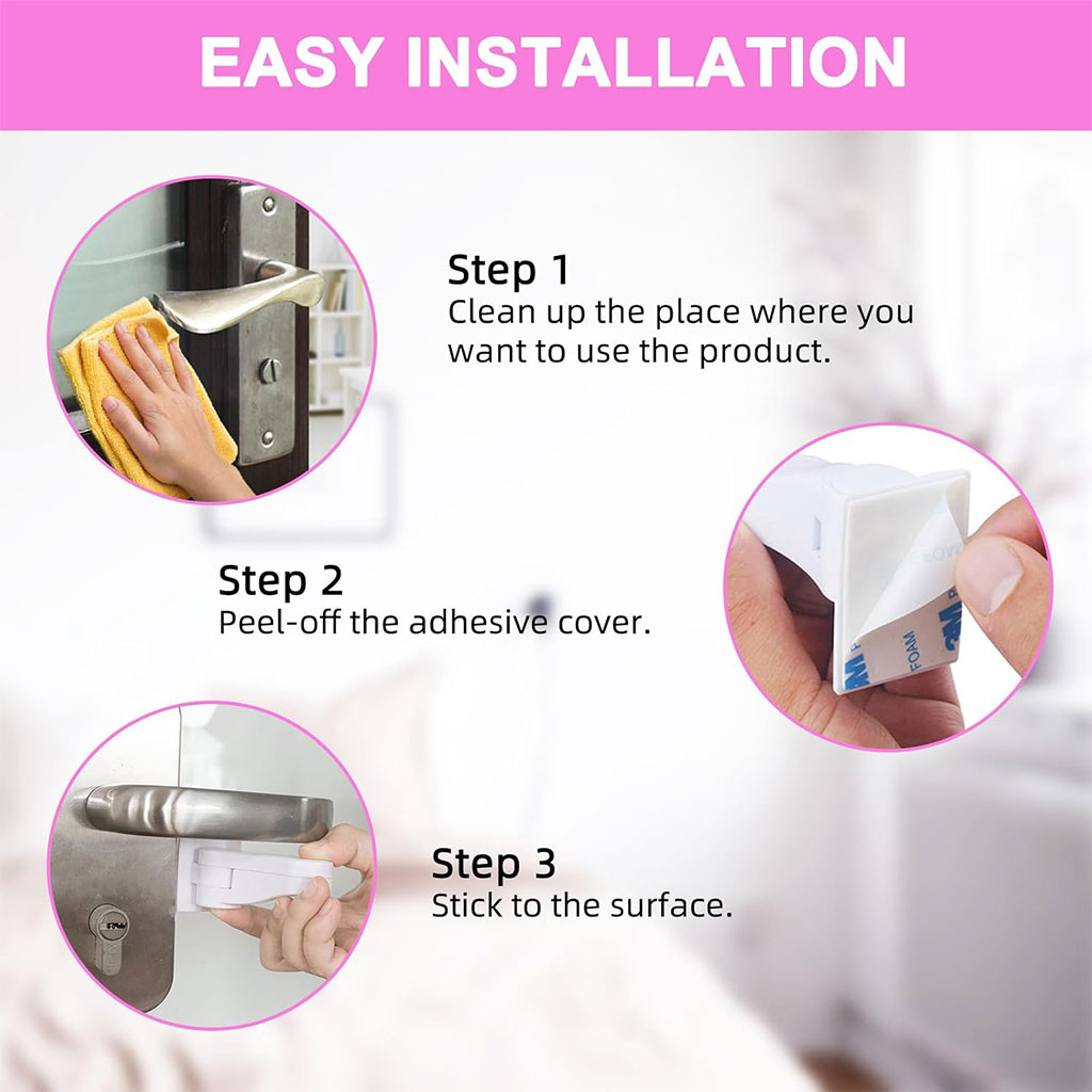 - FACILE À INSTALLER : Les verrous de sécurité enfant pour portes sont faciles à installer, sans perçage ni vis de fixation ; il suffit de nettoyer la surface de la porte et de coller ce produit sous la poignée.