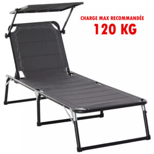 – Joli transat bain de soleil design moderne mélant sobriété et élégance- Convient autant à un usage extérieur comme intérieur (véranda, patio)- Dossier inclinable réglable à 5 positions suivant vos préférences et la situation : bronzer, lire un livre, discuter, grignoter, etc…- Transat grand confort : dossier inclinable multi-positions, pare-soleil ajustable, etc…- Bain de soleil très pratique d’utilisation : pliable et facilité d’entretien grâce à sa structure en aluminium et à son revêtement textilène résistant à l’eau (séchage rapide), huile, soleil– Pieds antidérapants pour une stabilité optimale et afin de protéger votre sol des rayures